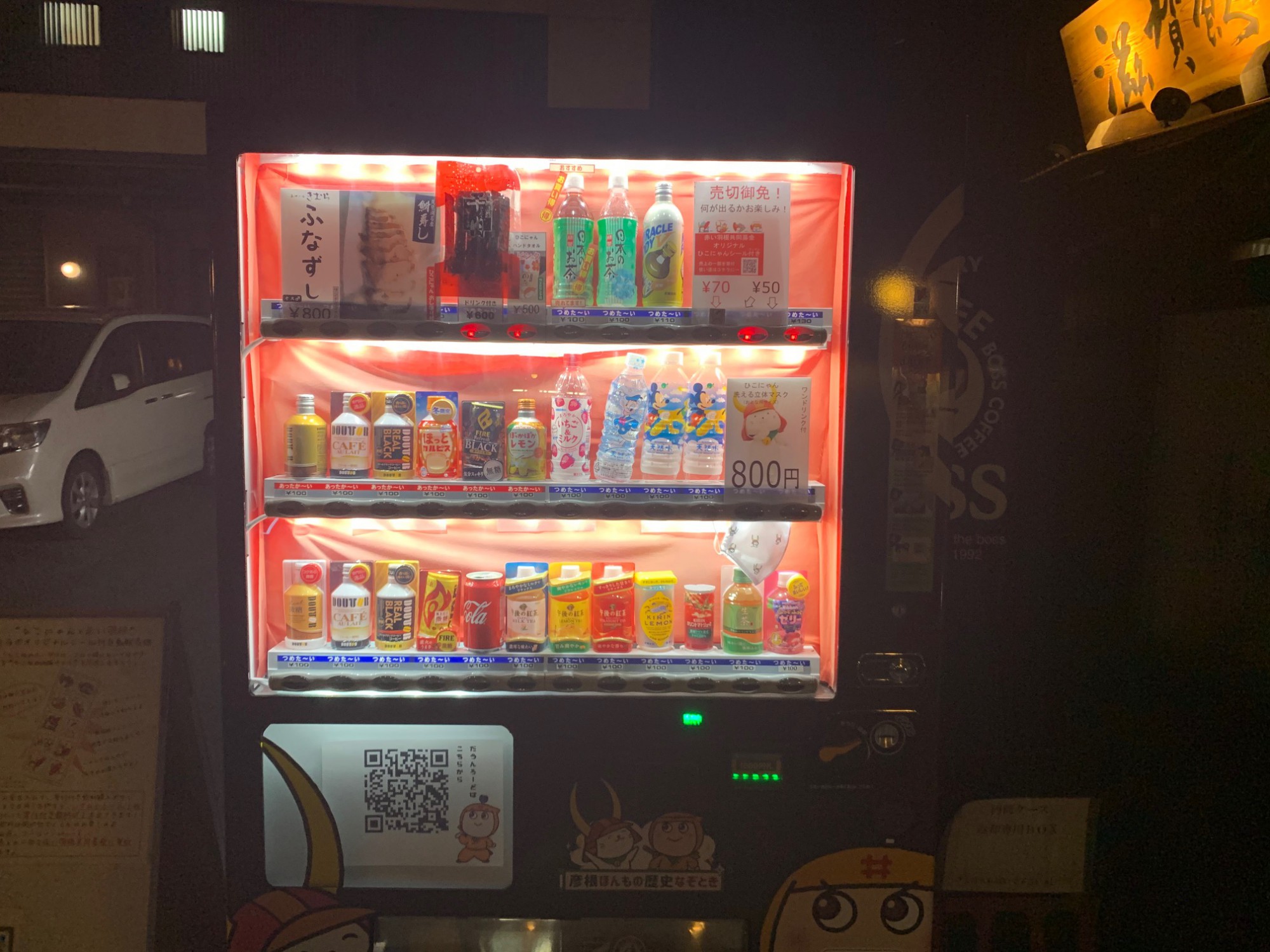 いかがだったでしょうか?滋賀県の郷土料理鮒ずしが買える自動販売機。おそらく世界にここだけの自販機ですので、彦根に来られた際は是非お立ちよりください。目印は「井伊直虎」・「虎松」の顔だしパネルです。