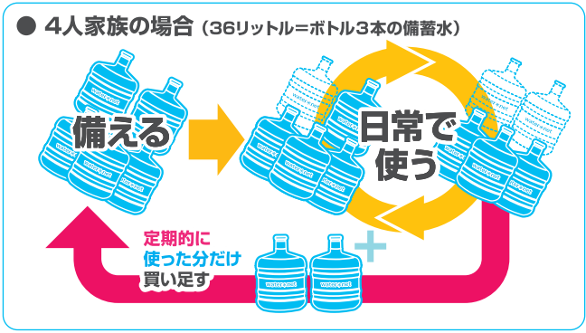 普段から少し多めにボトルを購入しておき、日常生活で先に購入したボトルから使用していきます。ご自身で設定した在庫本数になったら、使用した本数だけ買い足していくことで、常に災害時に必要な量のお水を備蓄することが出来ます。このようにローリングストックでは、一定量を確保しながら消費と購入を繰り返すことで備蓄水の鮮度を保ち、いざという時に備えることが出来ます。